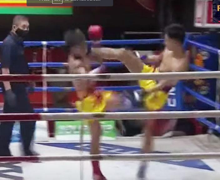 ไตรเทพเจอศอกขวาเข้าที่คางน๊อกในยกที่ 3